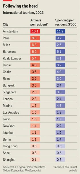 Οι επισκέπτες της Οσάκα, της αρχαίας δεύτερης πόλης της Ιαπωνίας, ξοδεύουν 4.900 δολάρια ανά κάτοικο- οι επισκέπτες της Μαδρίτης ξοδεύουν 4.300 δολάρια. Καμία από τις δύο πόλεις δεν είναι ιδιαίτερα πολυσύχναστη, με τέσσερις και δύο επισκέπτες ετησίως ανά κάτοικο, αντίστοιχα. Αυτό θα ακούγεται πολύ ελκυστικό για τους κατοίκους του Άμστερνταμ. Ωστόσο, ίσως ακόμη και λίγοι τουρίστες να είναι ακόμη πάρα πολλοί.