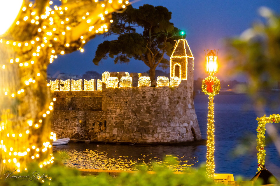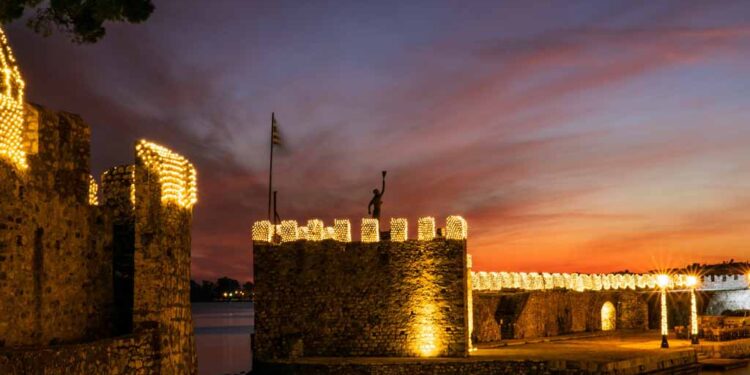 Το ενετικό λιμάνι, με το χαρακτηριστικό σχήμα πετάλου, γίνεται η καρδιά του εορτασμού. Οι δύο βραχίονες του κάστρου φωταγωγούνται και αγκαλιάζουν τη θάλασσα, ενώ τα φώτα καθρεφτίζονται στα ήρεμα χειμωνιάτικα νερά. Πάνω από την πόλη, το επιβλητικό κάστρο της Ναυπάκτου μοιάζει να αιωρείται φωτισμένο, δημιουργώντας μια ατμόσφαιρα σχεδόν κινηματογραφική. Στο βάθος, η Γέφυρα Ρίου Αντιρρίου προσθέτει μια σύγχρονη πινελιά στο σκηνικό, ενώνοντας το παρελθόν με το παρόν.