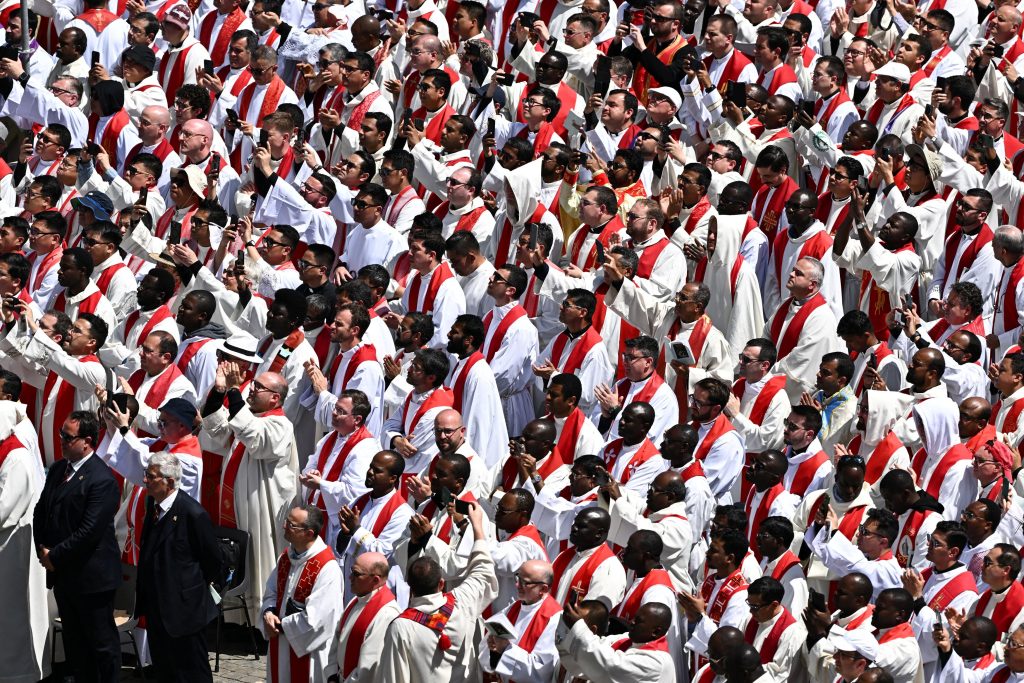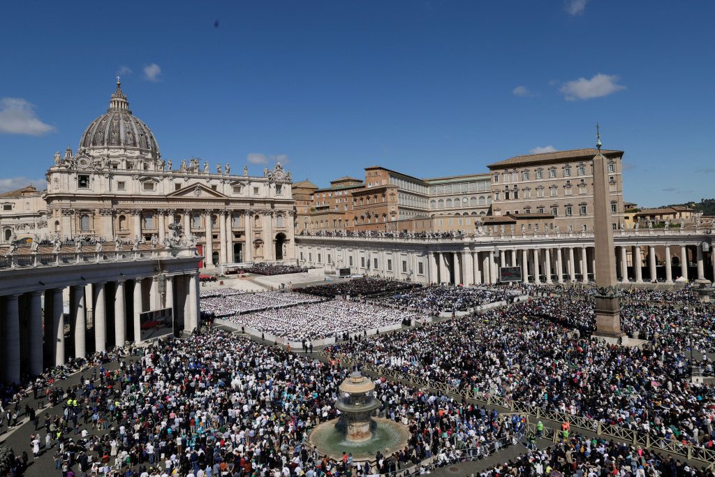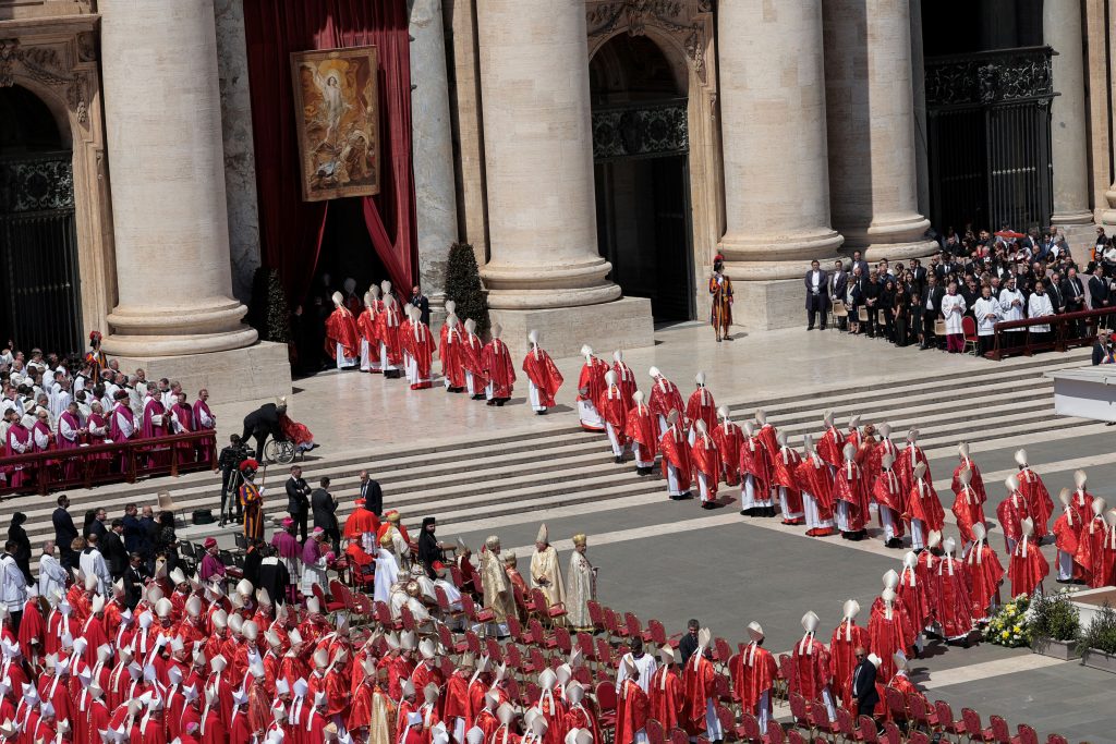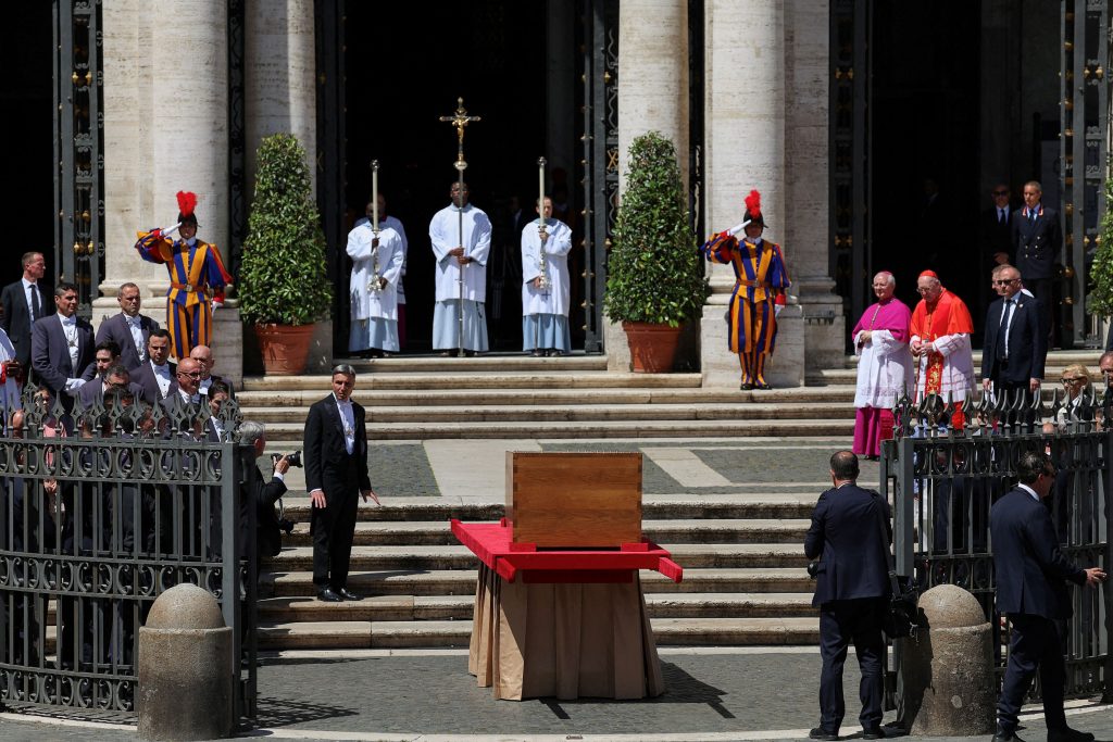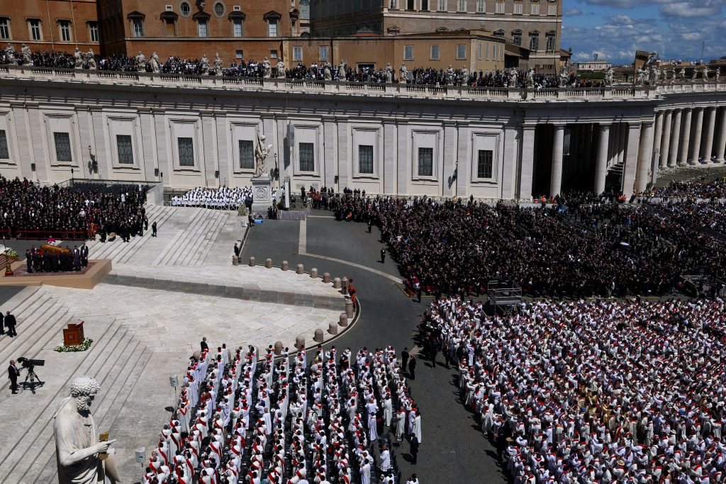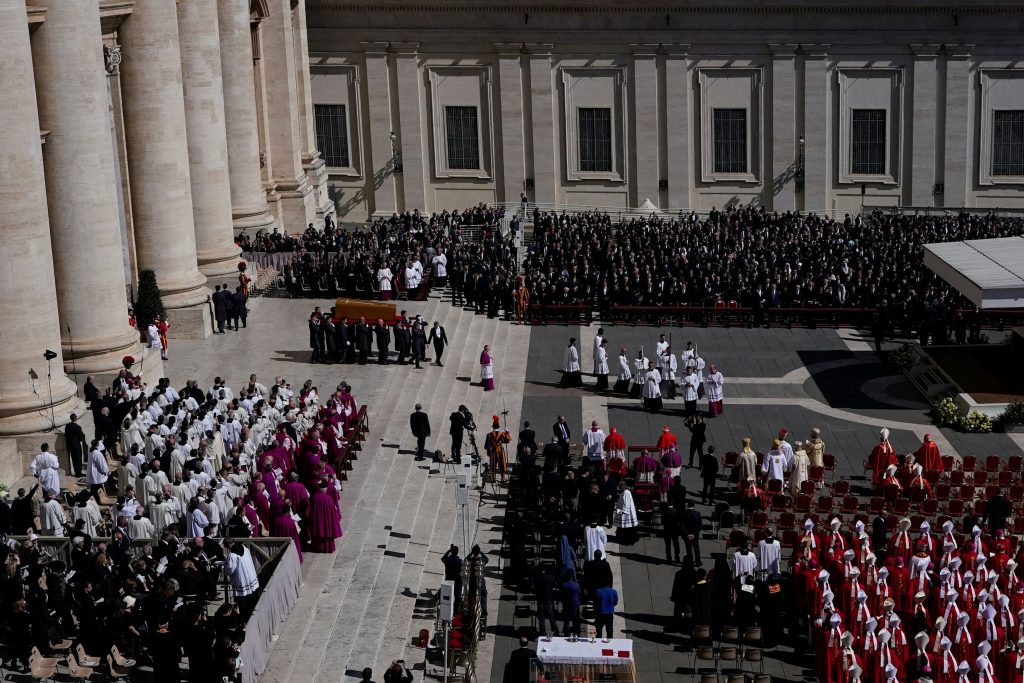 Πάνω από 250.000 πιστοί κατέκλυσαν την πλατεία του Αγίου Πέτρου στο Βατικανό για να παρακολουθήσουν την κηδεία, η οποία ξεκίνησε στις 10:10 τοπική ώρα. Δεκάδες διεθνείς ηγέτες βρέθηκαν στις θέσεις των επισήμων, συμπεριλαμβανομένων του Προέδρου των ΗΠΑ Ντόναλντ Τραμπ, του Γάλλου Προέδρου Εμάνουελ Μακρόν, του Ουκρανού Προέδρου Βολοντίμιρ Ζελένσκι, του Έλληνα Πρωθυπουργού Κυριάκου Μητσοτάκη και της Προέδρου της Ευρωπαϊκής Επιτροπής Ούρσουλα φον ντερ Λάιεν.