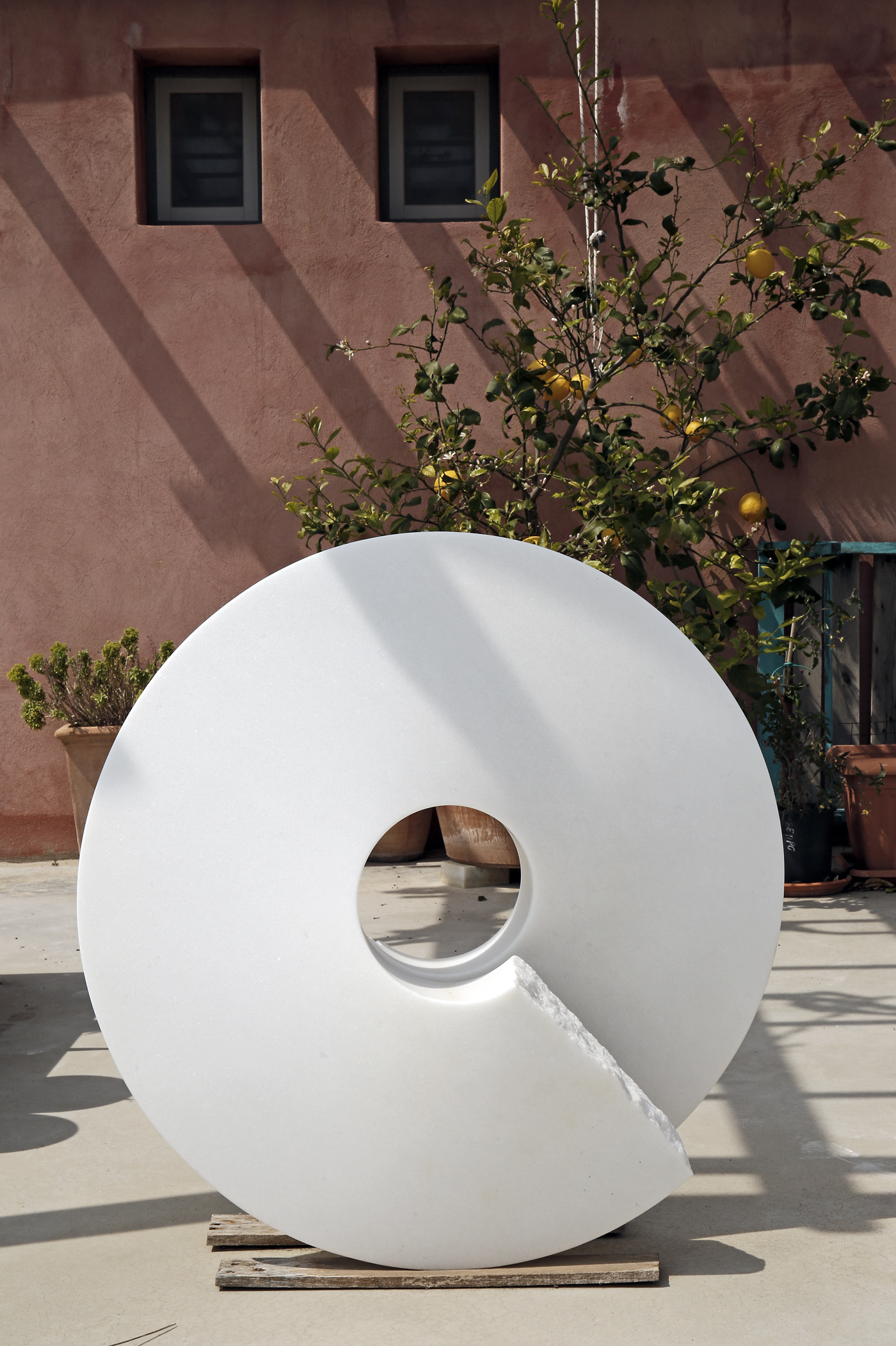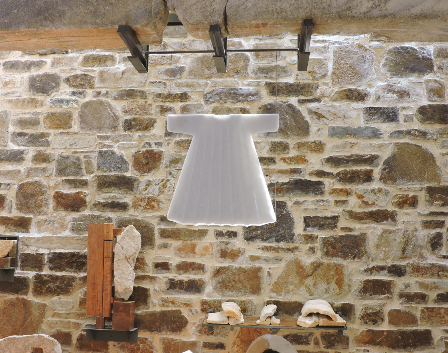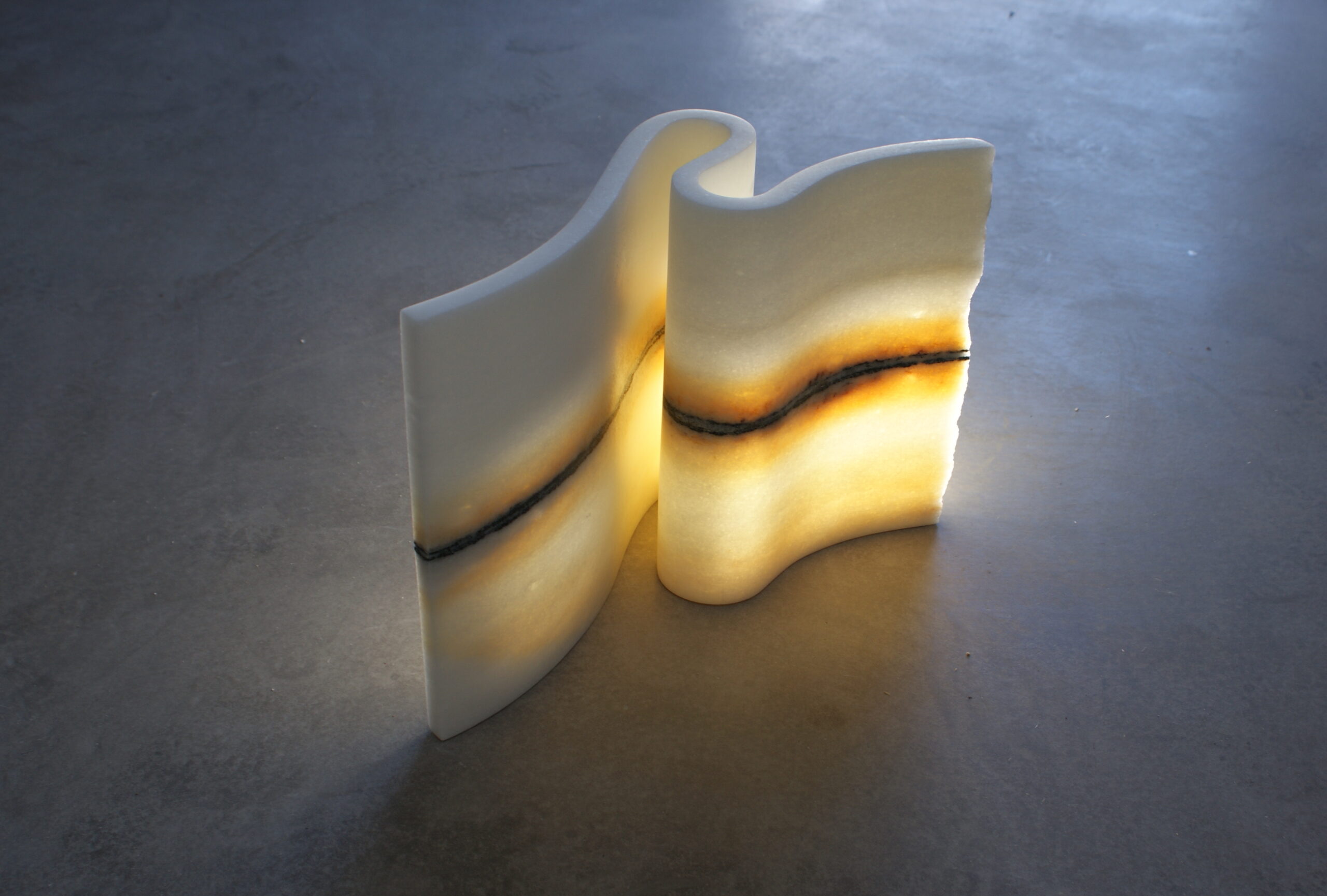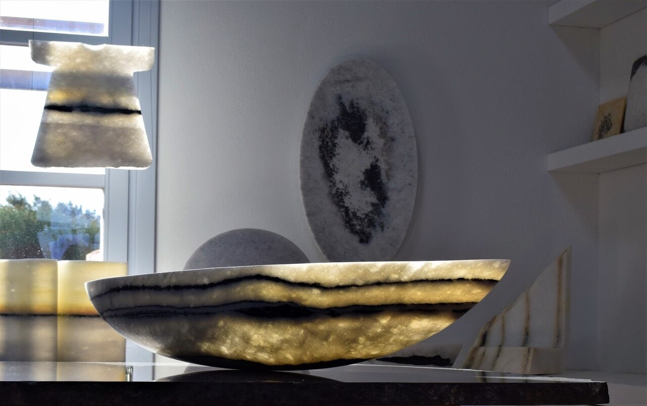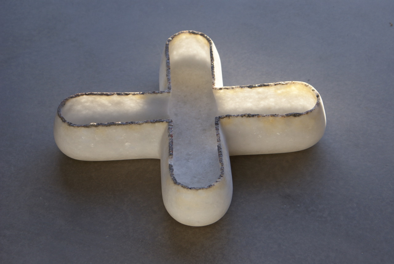 Έργα ανάλαφρα, σχεδόν αέρινα από ένα υλικό που βγαίνει από τα σπλάχνα της γης. Φτερούγες, φύλλα φυτών, σπείρες, μετασχηματίζουν το φως και δημιουργούν πρωτόγνωρες εικόνες. «Το μάρμαρο ανήκει στο φως. Χωρίς το φως δεν υπάρχει. Για μένα το μάρμαρο είναι σαν να έχει γίνει το φως, ύλη», μάς λέει ενώ σουρουπώνει.