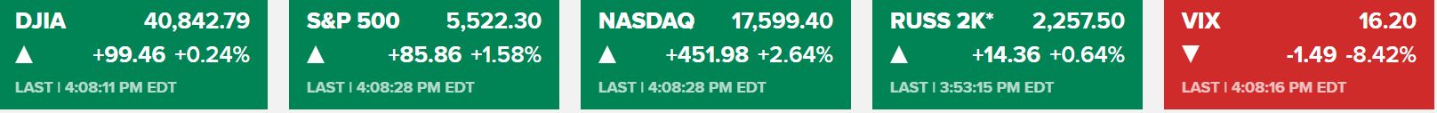 Σε αυτό το κλίμα, ο δείκτης Dow Jones σημείωσε αύξηση +0,24% στις 40.842 μον., ο δείκτης S&P 500 ενισχύθηκε +1,58% στις 5.522 μον. ενώ ο δείκτης Nasdaq κατέγραψε άνοδο +2,64% στις 17.599 μον.