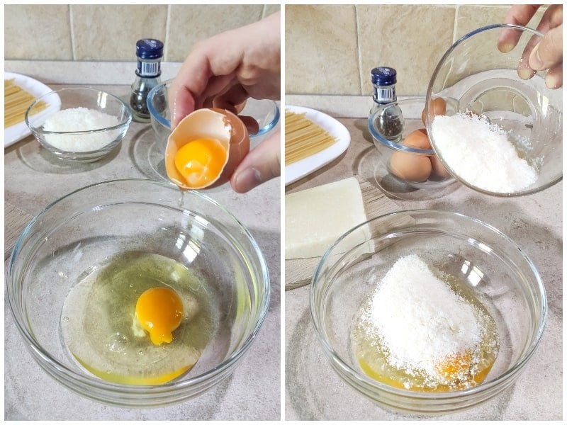 Σε ένα μεσαίο μπολ ρίχνουμε το τυρί και τους κρόκους των αυγών.. Ανακατεύουμε σιγά σιγά με το σύρμα και προσθέτουμε λίγο λίγο 2 κουταλιές νερό από αυτό που βρασαμε τα μακαρόνια.. Προσοχή όμως το ρίχνουμε σιγά σιγά και ανακατεύουμε συνεχώς ώστε να πέσει η θερμοκρασία και να μην ψηθούν τα αυγα…