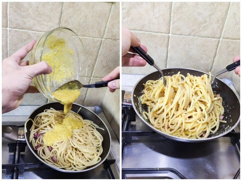 Αφού λοιπόν η σάλτσα μας είναι έτοιμη και οριακά παχυρρευστη,τότε ρίχνουμε μέσα στο γκουαντσιάλε τα ζυμαρικά μας και ανακατεύουμε καλά να πάει παντού.. Στο τέλος ρίχνουμε την σάλτσα πεκορινο αυγό που φτιαξαμε πάνω στα σπαγγέτι μέσα στο τηγάνι και ανακατεύουμε γερά… Σερβίρουμε σε βαθύ πιάτο με μπόλικο φρεσκοτριμμένο πιπέρι..