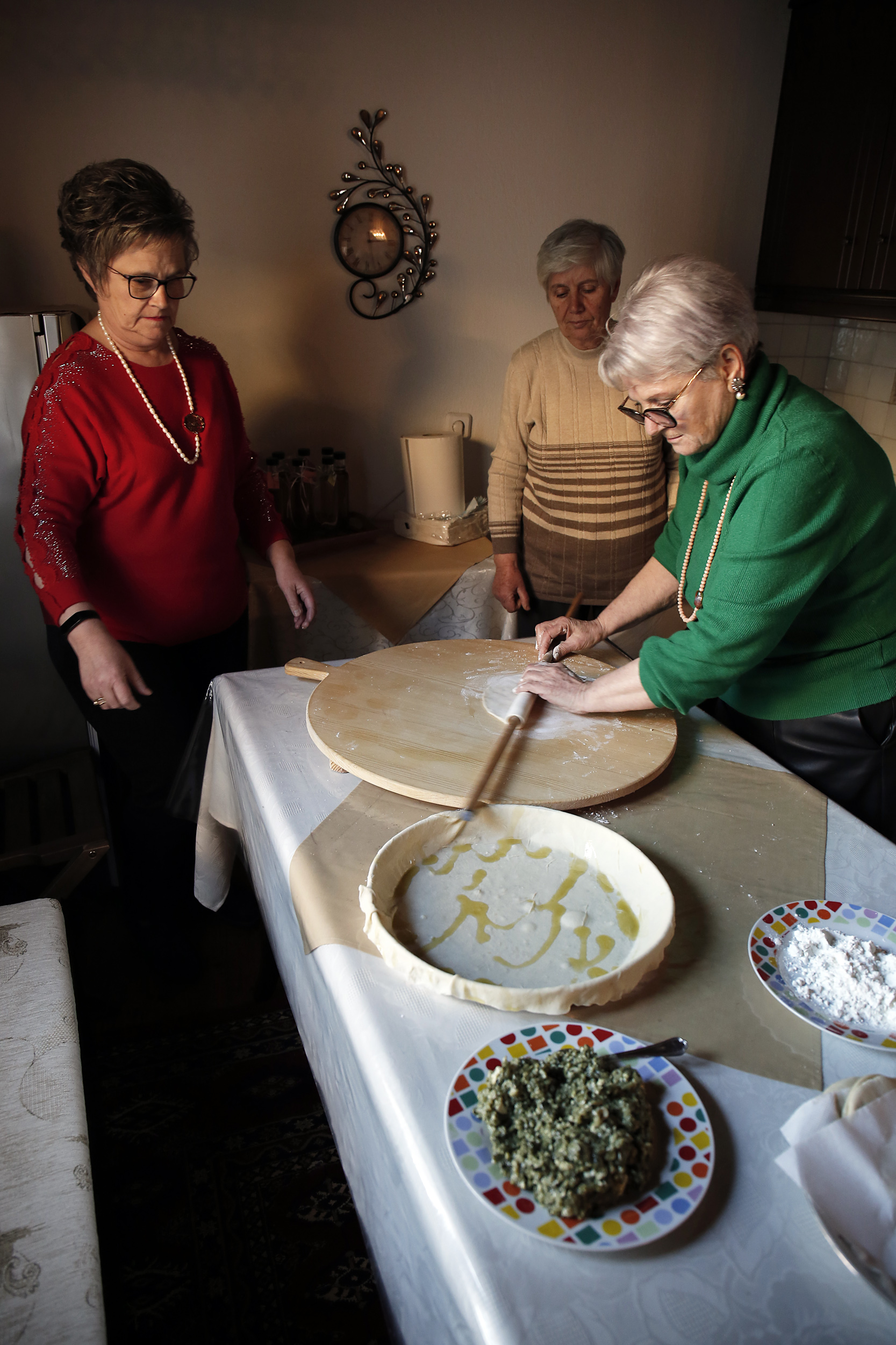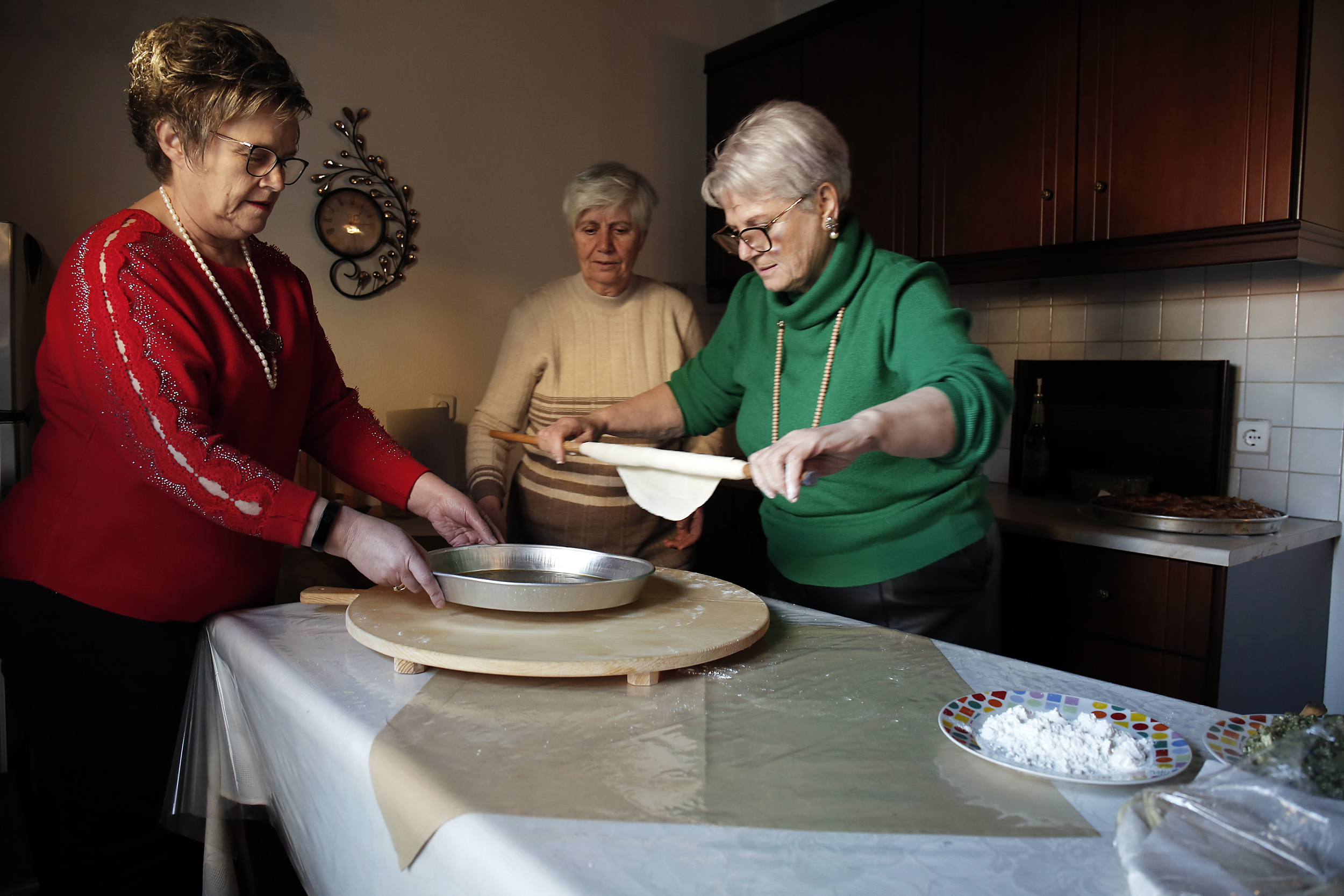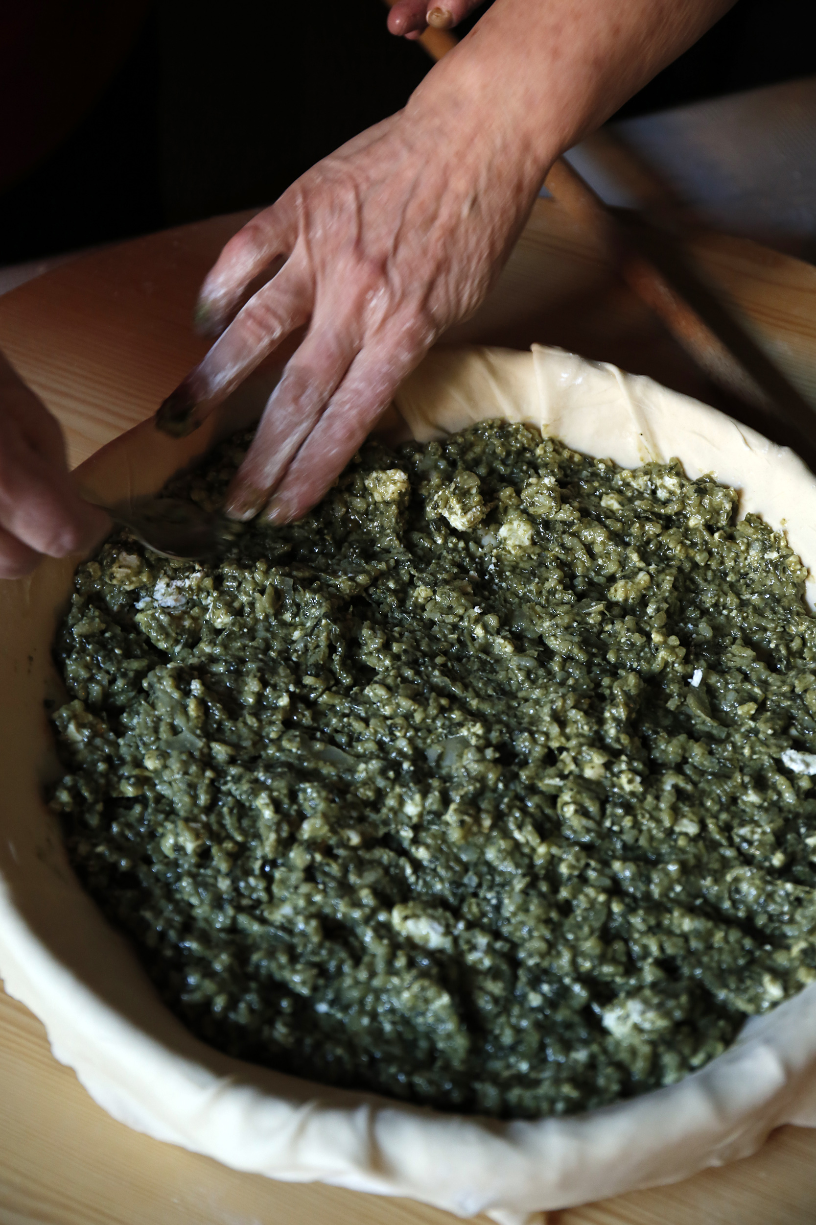«Εδώ παλιά, οι γονείς μας έφτιαχναν πίτες σαν το μοναδικό κύριο φαγητό της μέρας. Είχαμε τις πίτες σαν το καθημερινό μας φαγητό» λέει η Αλεξάνδρα Βελετάνη καθώς ετοιμάζει μαζί με την Κατερίνα Γιαννούδη και τη Βούλα Παρασκευαΐδη την παραδοσιακή σπανακοτυρόπιτα της Ραψάνης.