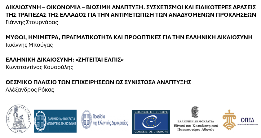 α] ο Διοικητής της Τράπεζας της Ελλάδος (ΤτΕ) και μέλος του Διοικητικού Συμβουλίου της Ευρωπαϊκής Κεντρικής Τράπεζας, Οικονομολόγος, Πανεπιστημιακός, τ. Υπουργός Οικονομικών, κ. Γιάννης Στουρνάρας, με θέμα ομιλίας: «ΔΙΚΑΙΟΣΥΝΗ – ΟΙΚΟΝΟΜΙΑ – ΒΙΩΣΙΜΗ ΑΝΑΠΤΥΞΗ. ΣΥΣΧΕΤΙΣΜΟΙ ΚΑΙ ΕΙΔΙΚΟΤΕΡΕΣ ΔΡΑΣΕΙΣ ΤΗΣ ΤΡΑΠΕΖΑΣ ΤΗΣ ΕΛΛΑΔΟΣ ΓΙΑ ΤΗΝ ΑΝΤΙΜΕΤΩΠΙΣΗ ΤΩΝ ΑΝΑΔΥΟΜΕΝΩΝ ΠΡΟΚΛΗΣΕΩΝ».