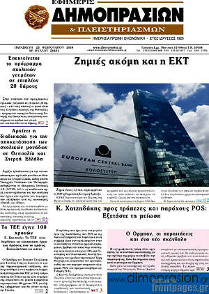 <div id="General" class="tabbertab"> <p data-sourcepos="7:1-7:106"><strong>Στις 23 Φεβρουαρίου 2024, τα πρωτοσέλιδα των εφημερίδων :</strong></p> <h5 style="text-align: center;">Πολιτικές εφημερίδες</h5> <div class="thumbdiv" style="text-align: center;"> <div class="thumber"> <div class="paperName"><a href="https://www.frontpages.gr/d/20240223/1/Η-Καθημερινή">Η Καθημερινή</a></div> <a href="https://www.frontpages.gr/d/20240223/1/Η-Καθημερινή"><img src="https://www.frontpages.gr/data/2024/20240223/HKathimerini300.jpg" srcset="/data/2024/20240223/HKathimerini600.jpg 2x" alt="Η Καθημερινή - Προς εκλογή αρχηγού σε ακραία πόλωση στον ΣΥΡΙΖΑ" /></a> </div> <div class="thumber"> <div class="paperName"><a href="https://www.frontpages.gr/d/20240223/2/Τα-Νέα">Τα Νέα</a></div> <a href="https://www.frontpages.gr/d/20240223/2/Τα-Νέα"><img src="https://www.frontpages.gr/data/2024/20240223/TaNea300.jpg" srcset="/data/2024/20240223/TaNea600.jpg 2x" alt="Τα Νέα - «Φύγε» - «Ρίξτε με»" /></a> </div> <div class="thumber"> <div class="paperName"><a href="https://www.frontpages.gr/d/20240223/8/Απογευματινή">Απογευματινή</a></div> <a href="https://www.frontpages.gr/d/20240223/8/Απογευματινή"><img src="https://www.frontpages.gr/data/2024/20240223/Apogeumatini300.jpg" srcset="/data/2024/20240223/Apogeumatini600.jpg 2x" alt="Απογευματινή - Ατομική βόμβα Τσίπρα" /></a> </div> <div class="thumber"> <div class="paperName"><a href="https://www.frontpages.gr/d/20240223/72/Η-εφημερίδα-των-συντακτών">Η εφημερίδα των συντακτών</a></div> <a href="https://www.frontpages.gr/d/20240223/72/Η-εφημερίδα-των-συντακτών"><img src="https://www.frontpages.gr/data/2024/20240223/EfSyn300.jpg" srcset="/data/2024/20240223/EfSyn600.jpg 2x" alt="Η εφημερίδα των συντακτών - Ποιος Σύριζα με ποιον πρόεδρο;" /></a> </div> <div class="thumber"> <div class="paperName"><a href="https://www.frontpages.gr/d/20240223/13/Αυγή">Αυγή</a></div> <a href="https://www.frontpages.gr/d/20240223/13/Αυγή"><img src="https://www.frontpages.gr/data/2024/20240223/Augi300.jpg" srcset="/data/2024/20240223/Augi600.jpg 2x" alt="Αυγή - Βρείτε μου αντίπαλο και πάμε" /></a> </div> <div class="thumber"> <div class="paperName"><a href="https://www.frontpages.gr/d/20240223/9/Ριζοσπάστης">Ριζοσπάστης</a></div> <a href="https://www.frontpages.gr/d/20240223/9/Ριζοσπάστης"><img src="https://www.frontpages.gr/data/2024/20240223/Rizospastis300.jpg" srcset="/data/2024/20240223/Rizospastis600.jpg 2x" alt="Ριζοσπάστης - Πολεμική αποστολή με ...κυβερνήτη τα συμφέροντα του κεφαλαίου και των NATO - ΕΕ" /></a> </div> <div class="thumber"> <div class="paperName"><a href="https://www.frontpages.gr/d/20240223/622/Manifesto">Manifesto</a></div> <a href="https://www.frontpages.gr/d/20240223/622/Manifesto"><img src="https://www.frontpages.gr/data/2024/20240223/GManifesto300.jpg" srcset="/data/2024/20240223/GManifesto600.jpg 2x" alt="Εφημερίδα Manifesto" /></a> </div> <div class="thumber"> <div class="paperName"><a href="https://www.frontpages.gr/d/20240223/44/Τύπος-Θεσσαλονίκης">Τύπος Θεσσαλονίκης</a></div> <a href="https://www.frontpages.gr/d/20240223/44/Τύπος-Θεσσαλονίκης"><img src="https://www.frontpages.gr/data/2024/20240223/TiposThessalonikis300.jpg" srcset="/data/2024/20240223/TiposThessalonikis600.jpg 2x" alt="Εφημερίδα Τύπος Θεσσαλονίκης" /></a> </div> <div class="thumber"> <div class="paperName"><a href="https://www.frontpages.gr/d/20240223/504/Kontra-News">Kontra News</a></div> <a href="https://www.frontpages.gr/d/20240223/504/Kontra-News"><img src="https://www.frontpages.gr/data/2024/20240223/KontraNews300.jpg" srcset="/data/2024/20240223/KontraNews600.jpg 2x" alt="Kontra News - Βρείτε μου αντίπαλο και πάμε σε εκλογές" /></a> </div> <div class="thumber"> <div class="paperName"><a href="https://www.frontpages.gr/d/20240223/27/Ελεύθερη-ώρα">Ελεύθερη ώρα</a></div> <a href="https://www.frontpages.gr/d/20240223/27/Ελεύθερη-ώρα"><img src="https://www.frontpages.gr/data/2024/20240223/Elora300.jpg" srcset="/data/2024/20240223/Elora600.jpg 2x" alt="Εφημερίδα Ελεύθερη ώρα" /></a> </div> <div class="thumber"> <div class="paperName"><a href="https://www.frontpages.gr/d/20240223/607/Political">Political</a></div> <a href="https://www.frontpages.gr/d/20240223/607/Political"><img src="https://www.frontpages.gr/data/2024/20240223/GPolitical300.jpg" srcset="/data/2024/20240223/GPolitical600.jpg 2x" alt="Εφημερίδα Political" /></a> </div> <div class="thumber"> <div class="paperName"><a href="https://www.frontpages.gr/d/20240223/601/ON-time">ON time</a></div> <a href="https://www.frontpages.gr/d/20240223/601/ON-time"><img src="https://www.frontpages.gr/data/2024/20240223/OnTme300.jpg" srcset="/data/2024/20240223/OnTme600.jpg 2x" alt="Εφημερίδα ON time" /></a> </div> </div> </div> <div style="text-align: center;"> <div></div> </div> <div id="Sports" class="tabbertab" style="text-align: center;"> <h5>Αθλητικές εφημερίδες</h5> <div class="thumbdiv"> <div class="thumber"> <div class="paperName"><a href="https://www.frontpages.gr/d/20240223/50/Sport-Day">Sport Day</a></div> <a href="https://www.frontpages.gr/d/20240223/50/Sport-Day"><img src="https://www.frontpages.gr/data/2024/20240223/SportDay300.jpg" srcset="/data/2024/20240223/SportDay600.jpg 2x" alt="Εφημερίδα Sport Day" /></a> </div> <div cla