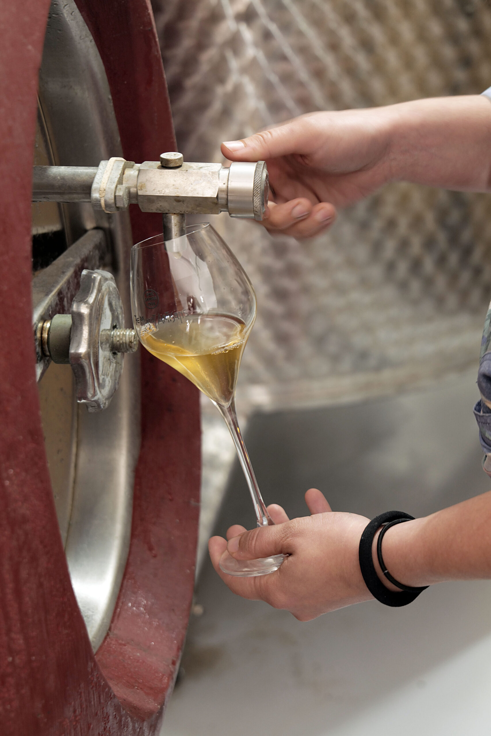 Στο οινοποιείο στο Καρλόβασι γίνονται οι κυριότερες οινοποιητικές διαδικασίες, η παραλαβή σταφυλιών, η διαλογή, η οινοποίηση, η παλαίωση και η εμφιάλωση. Εκτός από τις μεταλλικές, μια σειρά από «αβγά», όπως αποκαλούνται οι τσιμεντένιες δεξαμενές, κυριαρχούν στο χώρο, καλύπτοντας με τις καμπύλες τους και την απόσταση με το μέλλον της σύγχρονης οινοποίησης. Πριν ξεκινήσουμε για τις επισκέψεις στα αμπελοτόπια, προλαβαίνουμε μια γευστική δοκιμή των πολύ νέων κρασιών που ξεκίνησαν τη διαδικασία τους μέσα στα «αβγά» με τη φροντίδα και την απλά κατανοητή επεξήγηση από την οινολόγο του ΕΟΣΣ Μαρία Βουλαρίνου.