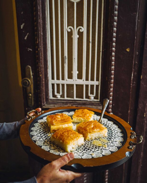 Στα πιο εύρωστα σπίτια της Φλώρινας, το χριστουγεννιάτικο τραπέζι είχε πάντοτε έναν επίλογο γεμάτο άρωμα: ένα σιροπιαστό γλυκό που έκλεινε τη γιορτή όσο αρωματικά έκαιγε το τζάκι. Μπακλαβάς και γαλακτομπούρεκο θεωρούνταν αναπόσπαστα από τις μεγάλες μέρες του δωδεκαημέρου, δείχνοντας όχι μόνο τη γαστρονομική παράδοση της περιοχής, αλλά και την οικονομική ευμάρεια της οικογένειας.
